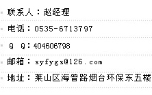 聯(lián)系人:趙經理 電話:0535-6713797 傳真:0535-6713797